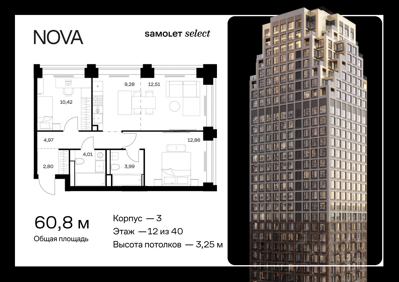 Строим кварталы для жизни с заботой о будущем. Предлагается 2-комнатная квартира премиум-класса 60,84 кв.м в корпусе 3 на 12 этаже, в ЖК "NOVA"