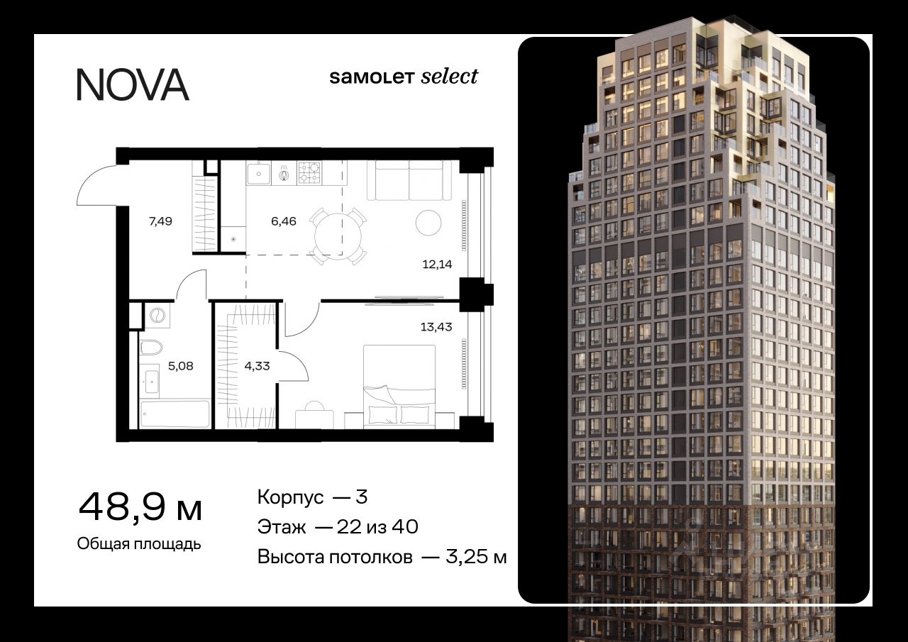 Строим кварталы для жизни с заботой о будущем. Предлагается 1-комнатная квартира премиум-класса 48,93 кв.м в корпусе 3 на 22 этаже, в ЖК "NOVA"
