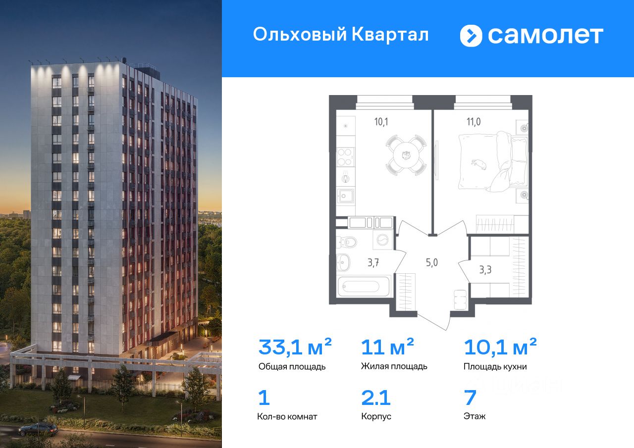 Строим кварталы для жизни с заботой о будущем. Предлагается 1-комнатная квартира комфорт-класса 33,1 кв.м в корпусе 2.1 на 7 этаже, в ЖК "Ольховый Квартал"