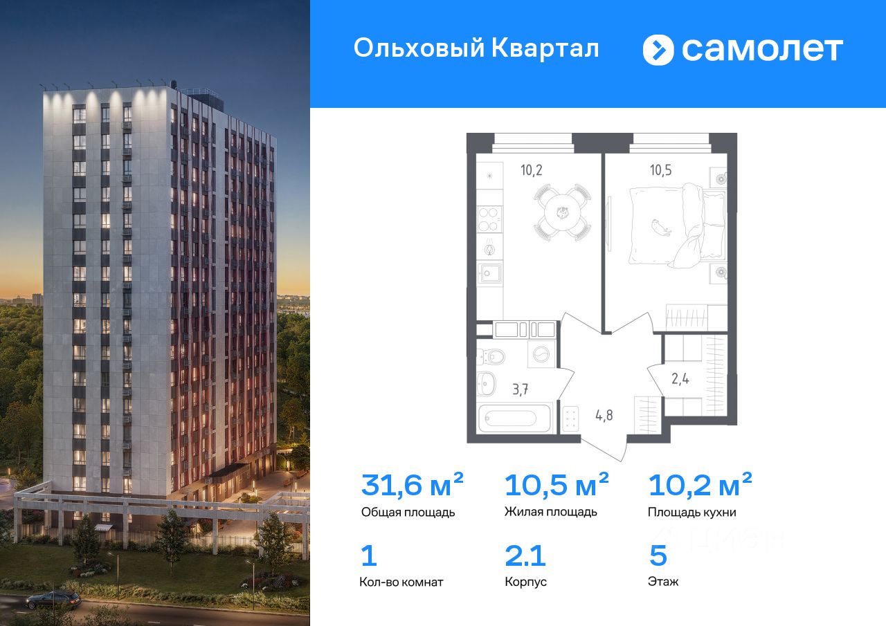 Строим кварталы для жизни с заботой о будущем. Предлагается 1-комнатная квартира комфорт-класса 31,6 кв.м в корпусе 2.1 на 5 этаже, в ЖК "Ольховый Квартал"