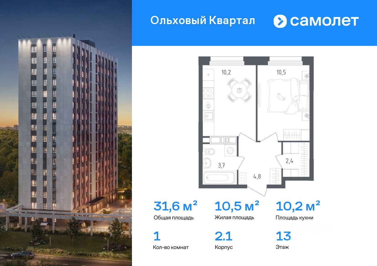 Строим кварталы для жизни с заботой о будущем. Предлагается 1-комнатная квартира комфорт-класса 31,6 кв.м в корпусе 2.1 на 13 этаже, в ЖК "Ольховый Квартал"