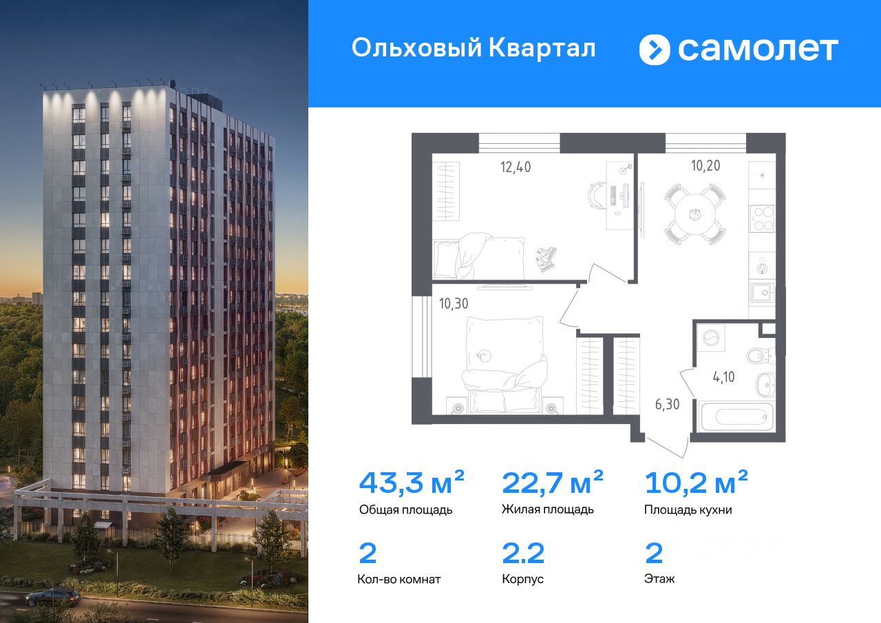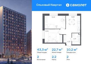 Строим кварталы для жизни с заботой о будущем. Предлагается 2-комнатная квартира комфорт-класса 43,3 кв.м в корпусе 2.2 на 2 этаже, в ЖК "Ольховый Квартал"