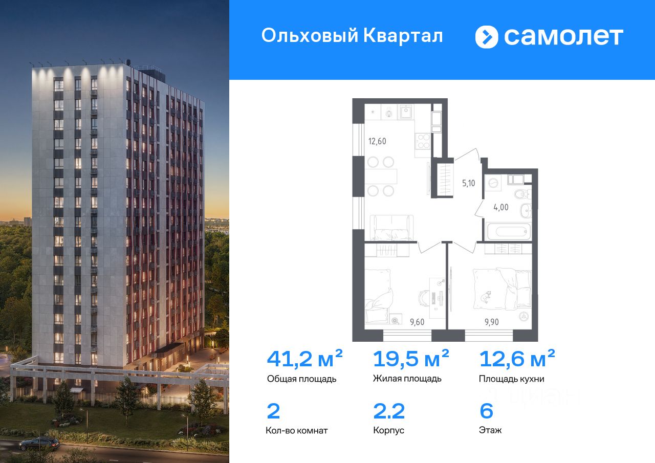 Строим кварталы для жизни с заботой о будущем. Предлагается 2-комнатная квартира комфорт-класса 41,2 кв.м в корпусе 2.2 на 6 этаже, в ЖК "Ольховый Квартал"