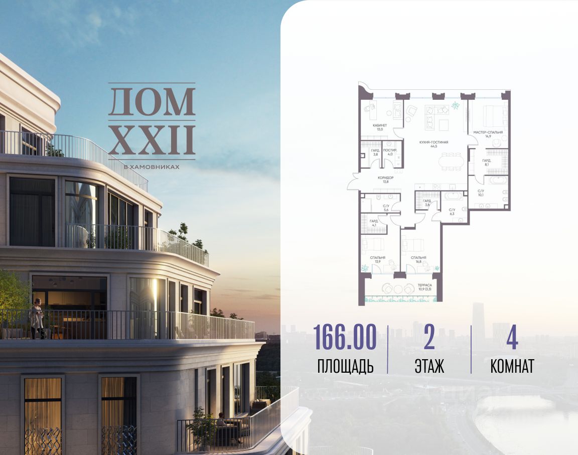 Продается просторная квартира площадью 166.00 м2 в жилом комплексе ДОМ XXII. Квартира находится в 1 секции корпуса 1. Этаж 2-й из 11. Квартира без чистовой отделки, с просторной кухней 44.50 м2. Жилая площадь 58.60 м2. Высота потолка от 3.50. ДОМ XXII расположен в Хамовниках - одном из самых респектабельных и тихих районов Москвы. Прямо напротив дома - Новодевичий монастырь, по соседству - Саввинская набережная Москвы-реки и сквер Девичьего поля. Расположение дома позволяет за считанные минуты добраться до всех знаковых мест столицы. Например, на автомобиле до Садового кольца 5 минут, до Дома Правительства - 8, до Кремля - 10. Неоклассический архитектурный проект переменной этажности (9-12 этажей) выполнен мастерской "Сергей Киселев и Партнеры". Фасады облицованы натуральным мрамором и гранитом, их оригинальный декор создан Андреем, Павлом и Петром Наличами. Благородный силуэт дома подчеркнут французскими балконами и моллированным остеклением на углах. В доме всего 109 квартир: лоты с патио, пентхаусы с панорамными террасами и возможностью установки камина, а также классические элитные квартиры с большими гостиными, мастер-спальнями, приватными ванными и гардеробными, террасами и лоджиями. У дома предусмотрена зона дроп-офф. В интерьерах лобби использованы люксовые отделочные материалы, эксклюзивные световые инсталляции, декоративное озеленение. Премиальную атмосферу дополняют зенитный фонарь с естественным светом, водопад, лаунж у камина и библиотека. Площадь лобби 660 м2, высота потолков - до 6,5 м. Двор превращен в тихий усадебный парк площадью 490 м2. Здесь создана приватная атмосфера для уединенного отдыха: дубовая аллея, пруд с живописным мостиком, галерея-берсо, зеленые комнаты, садовый камин, фонтаны. Для детей - игровая площадка. Для занятий спортом - воркаут. Предусмотрен контроль доступа на территорию, круглосуточная охрана, видеонаблюдение. Неподалеку находятся лучшие школы: 57, 1535, Филипповская школа, школа "Золотое Сечение". Для знатоков гастрономии рядом - лучшие рестораны: Verd, Peach, "Сахалин", Modus, Soho Rooms, модный гастрономический кластер "Усачевский рынок". Для занятий спортом - спортивный комплекс "Лужники". Для ценителей искусства - Московский дворец молодежи