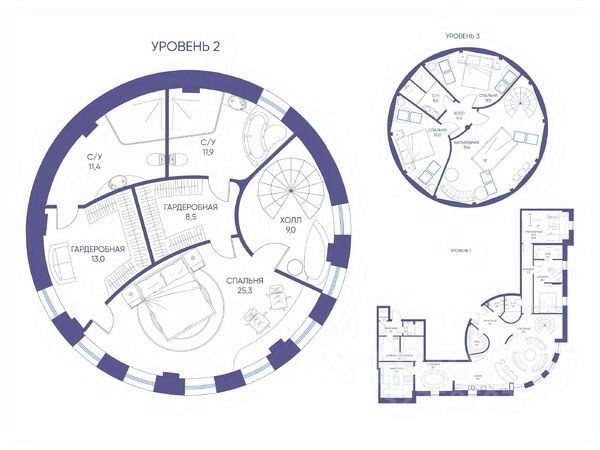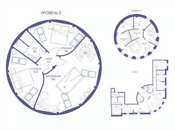 Уникальное предложение - роскошный пентхаус премиум-класса, занимающий три последних этажа в уже заселенном жилом комплексе. Планировка предусматривает размещение 3 спален, 5 гардеробных, 6 ванных комнат. На первом уровне площадью 220,3 м2 возможно устройство кухни-гостиной, тренажерного зала и двух спален с ванными и гардеробными. Второй уровень площадью 79,1 м2 запланирован под мастер-спальню с двумя ванными комнатами и двумя гардеробными. Из окон второго уровня открываются панорамные виды на три стороны света. На третьем уровне площадью 91,6 м2 просторный холл, в котором можно поставить бильярдный стол, оборудовать бар и танцпол, и даже обустроить вместительную сауну.