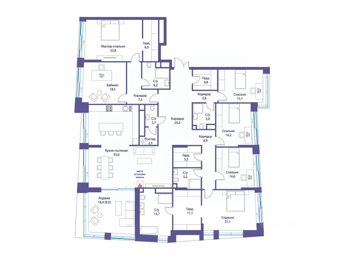 В квартире продуманная функциональная планировка с просторной кухней 53.00 м2. Жилая площадь 106.30 м2. Высота потолка от 3,65 м. Изолированные комнаты, 5 санузлов(1 раздельный и 4 совмещенных). Окна на три стороны света. Виды на природный парк и реку.