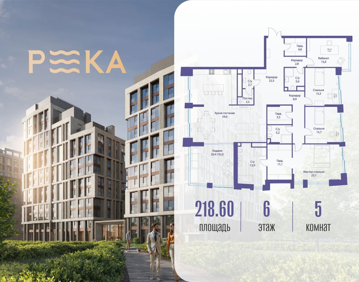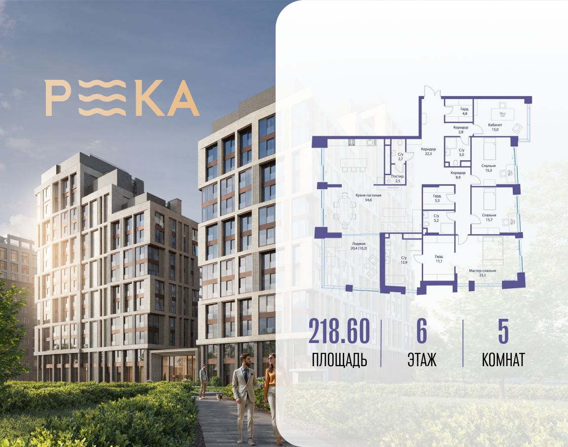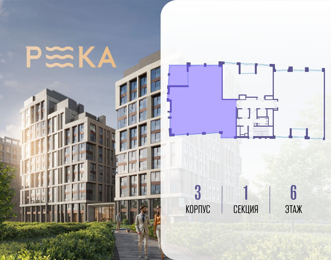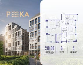 Продается просторная квартира площадью 218.60 м2 в жилом комплексе РЕКА. Квартира находится в 1 секции корпуса 3 (будет введен в эксплуатацию в 4 кв. 2026). Этаж 6-й из 16.