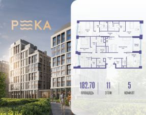 Продается просторная квартира площадью 182.70 м2 в жилом комплексе РЕКА. Квартира находится в 1 секции корпуса 3 (будет введен в эксплуатацию в 4 кв. 2026). Этаж 11-й из 16.