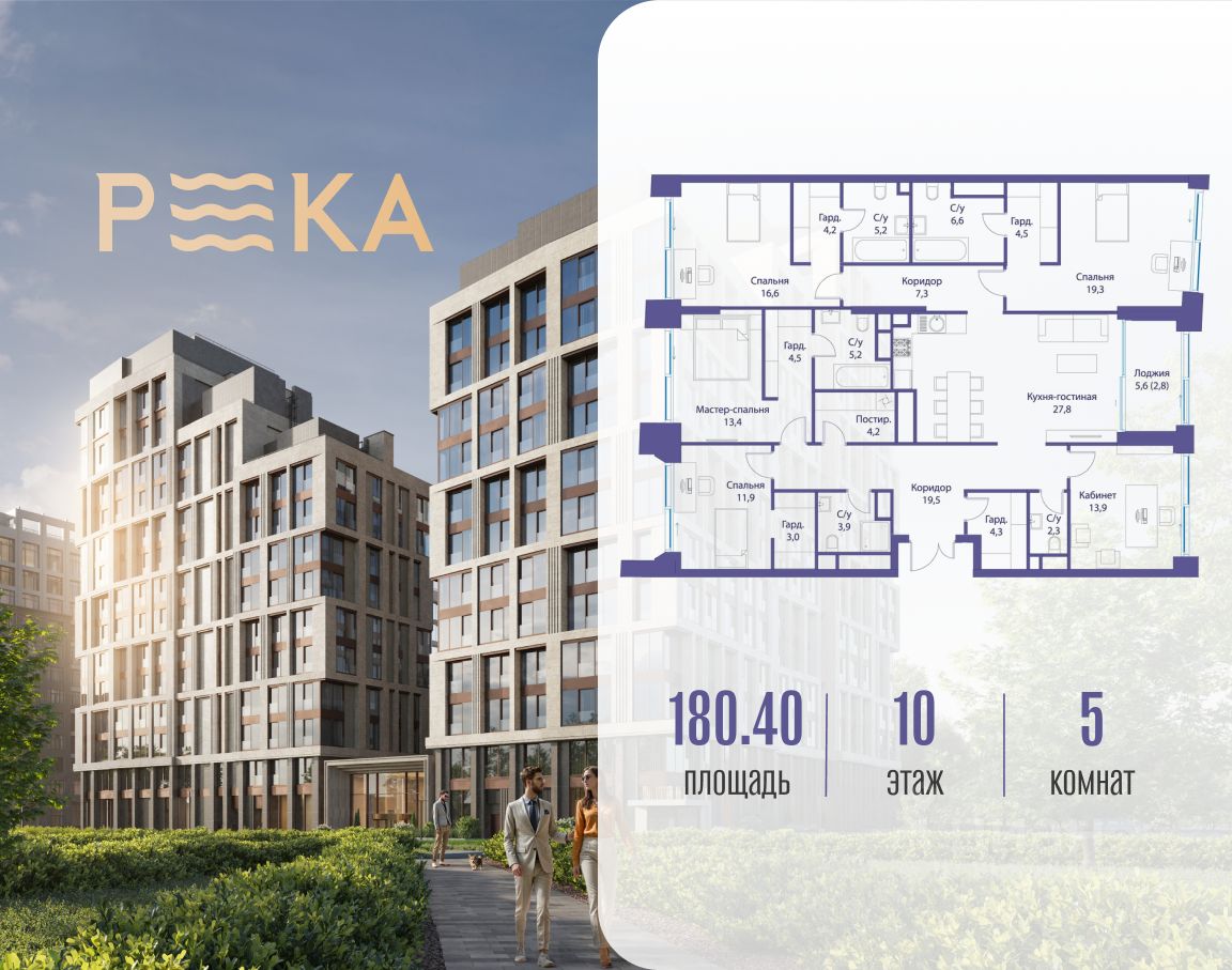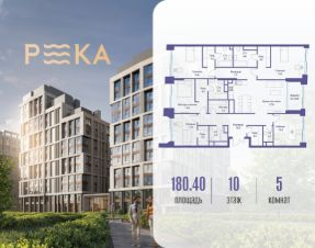 Продается просторная квартира площадью 180.40 м2 в жилом комплексе РЕКА. Квартира находится в 1 секции корпуса 3 (будет введен в эксплуатацию в 4 кв. 2026). Этаж 10-й из 16.
