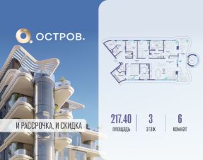 Продаётся квартира от застройщика: общая площадь 217.40 м², жилая 77.40 м², кухня 51.00 м², 3-й этаж, жилой квартал "Остров 10", (секция 1).  Срок сдачи: 2 квартал 2026 года.