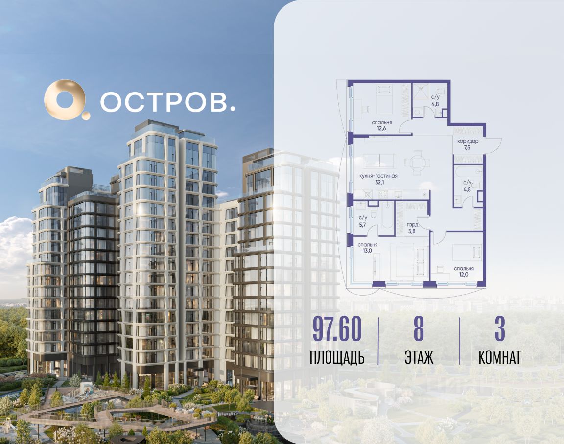 Продаётся 3-комн. квартира от застройщика: общая площадь 97.60 м², жилая 37.60 м², кухня 32.10 м², 8-й этаж, жилой квартал "Остров 12", корпус 4 (секция 1). Срок сдачи: 1 квартал 2029 года.
