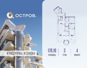 Продаётся 4-комн. квартира от застройщика: общая площадь 170.10 м², жилая 43.80 м², кухня 54.00 м², 3-й этаж, жилой квартал "Остров 10", (секция 1). Срок сдачи: 2 квартал 2026 года.
