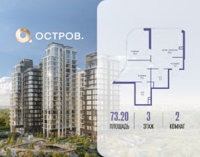 Продаётся 2-комн. квартира от застройщика: общая площадь 73.20 м², жилая 29.30 м², кухня 25.50 м², 3-й этаж, жилой квартал "Остров 12", корпус 3 (секция 1). Срок сдачи: 1 квартал 2029 года.