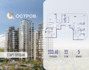Продаётся квартира от застройщика: общая площадь 233.40 м², жилая 126.90 м², кухня 7.00 м², 22-й этаж, жилой квартал "Остров 12", корпус 3 (секция 1). Срок сдачи: 1 квартал 2029 года.