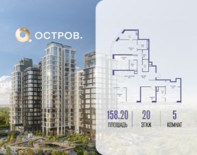 Продаётся квартира от застройщика: общая площадь 158.20 м², жилая 70.10 м², кухня 31.90 м², 20-й этаж, жилой квартал "Остров 12", корпус 3 (секция 1). Срок сдачи: 1 квартал 2029 года.