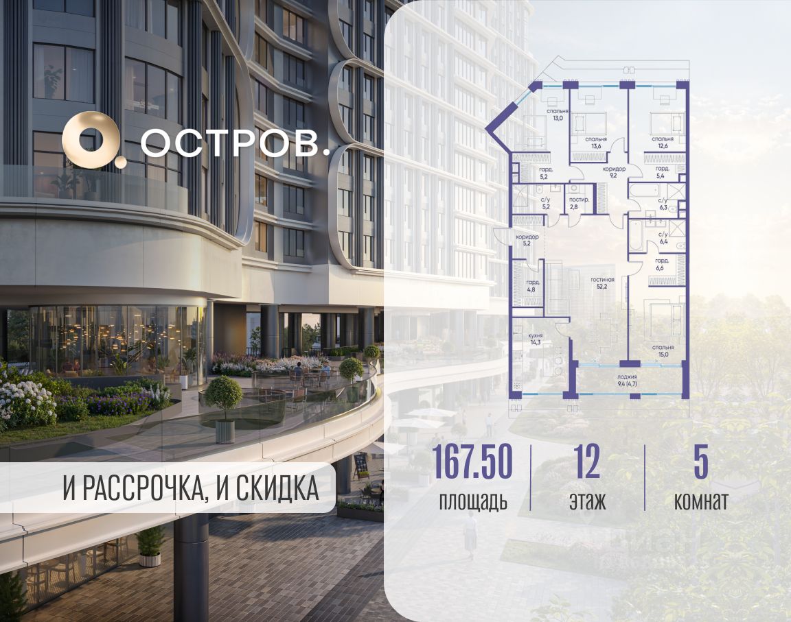 Продаётся многокомнатная квартира от застройщика: общая площадь 167.50 м², жилая 106.40 м², кухня 14.30 м², 12, жилой квартал "Остров 7", корпус 6 (7 квартал) (секция 2). срок сдачи: 4-кв. 2025.