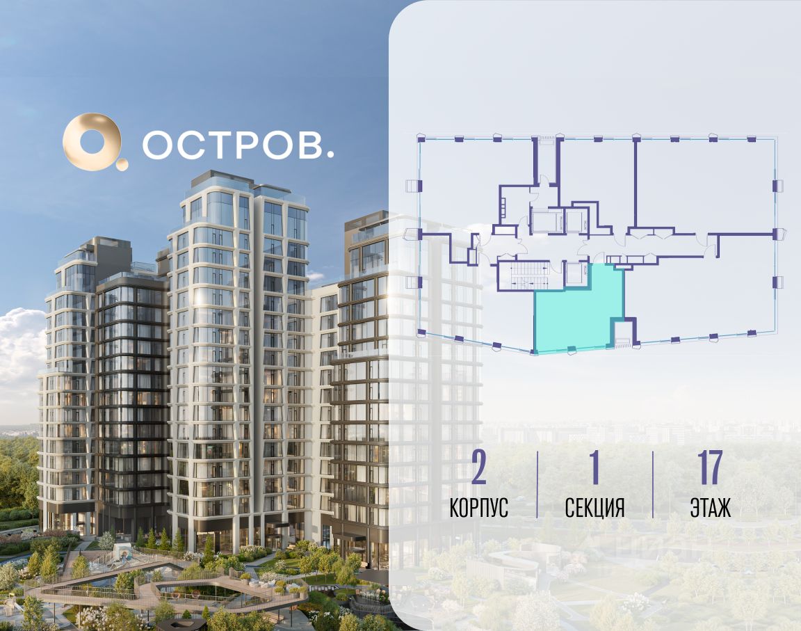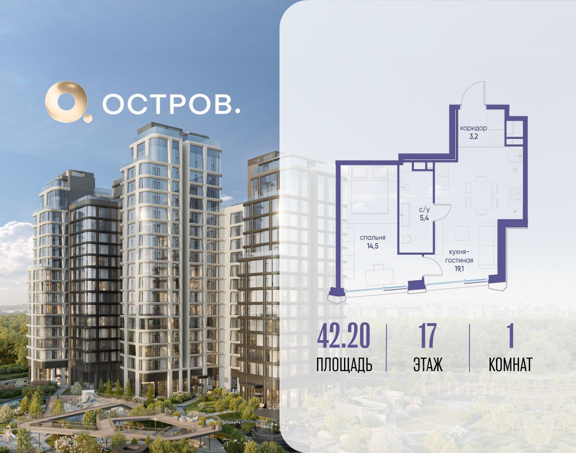 Продаётся 1-комн. квартира от застройщика: общая площадь 42.20 м², жилая 14.50 м², кухня 19.10 м², 17-й этаж, жилой квартал "Остров 12", корпус 2 (секция 1). Срок сдачи: 1 квартал 2029 года.