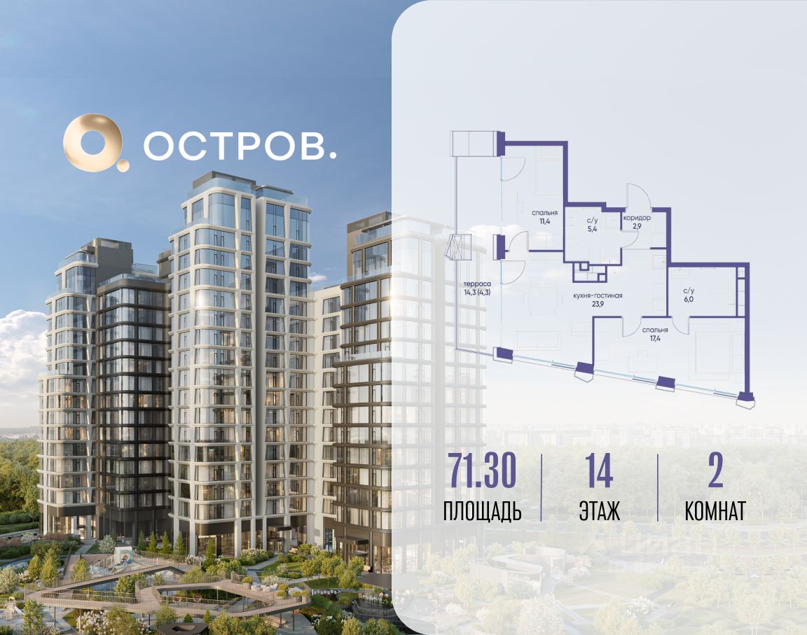 Продаётся 2-комн. квартира от застройщика: общая площадь 71.30 м², жилая 28.80 м², кухня 23.90 м², 14-й этаж, жилой квартал "Остров 12", корпус 2 (секция 1). Срок сдачи: 1 квартал 2029 года.