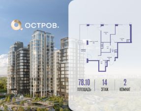 Продаётся 2-комн. квартира от застройщика: общая площадь 78.10 м², жилая 28.30 м², кухня 26.10 м², 14-й этаж, жилой квартал "Остров 12", корпус 2 (секция 1). Срок сдачи: 1 квартал 2029 года.