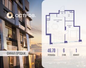 Продаётся 1-комн. квартира от застройщика: общая площадь 46.70 м², жилая 14.50 м², кухня 25.30 м², 6-й этаж, жилой квартал "Остров 12", корпус 2 (секция 1). Срок сдачи: 1 квартал 2029 года.