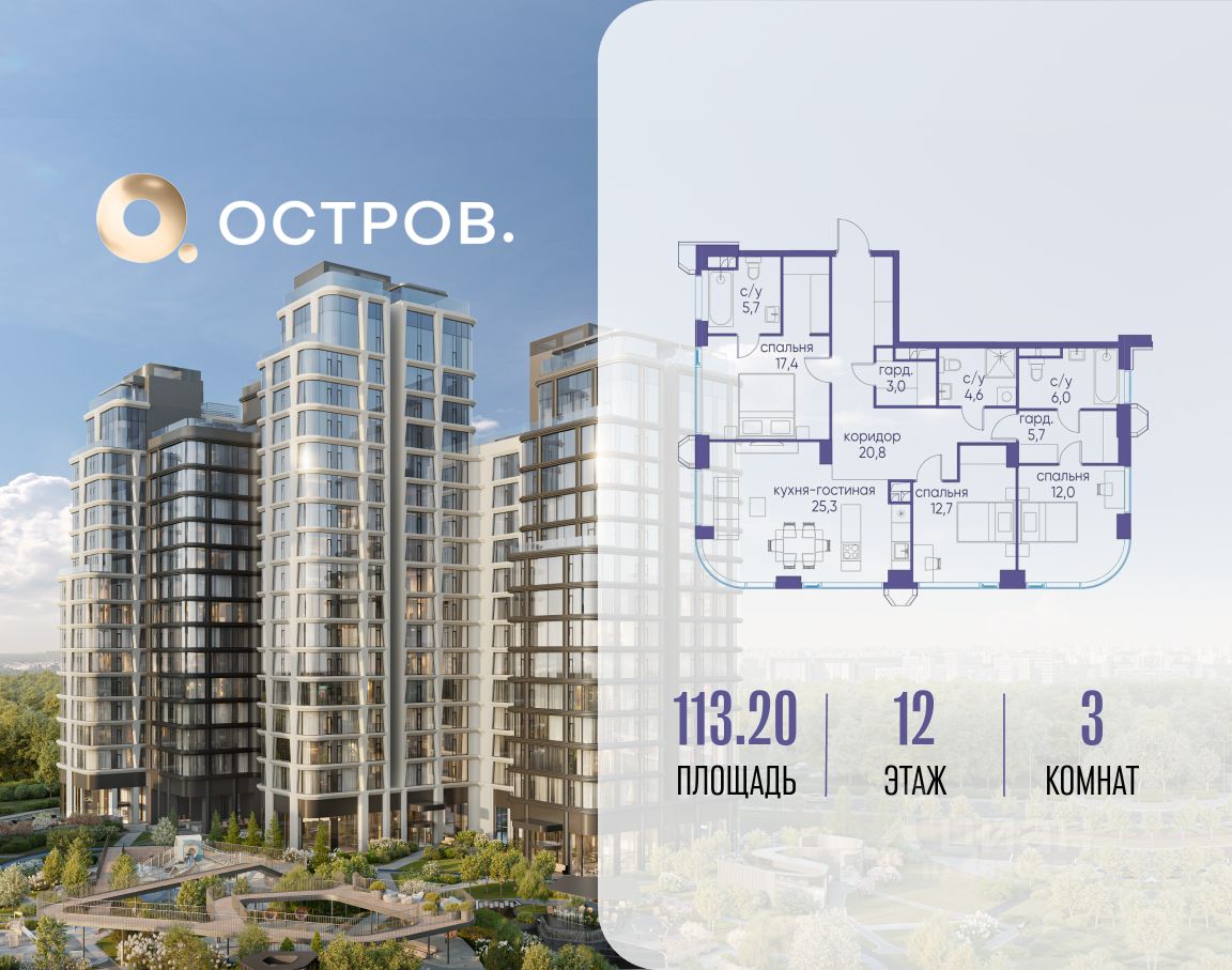 Продаётся 3-комн. квартира от застройщика: общая площадь 113.20 м², жилая 42.10 м², кухня 25.30 м², 12-й этаж, жилой квартал "Остров 12", корпус 1 (секция 1). Срок сдачи: 1 квартал 2029 года.