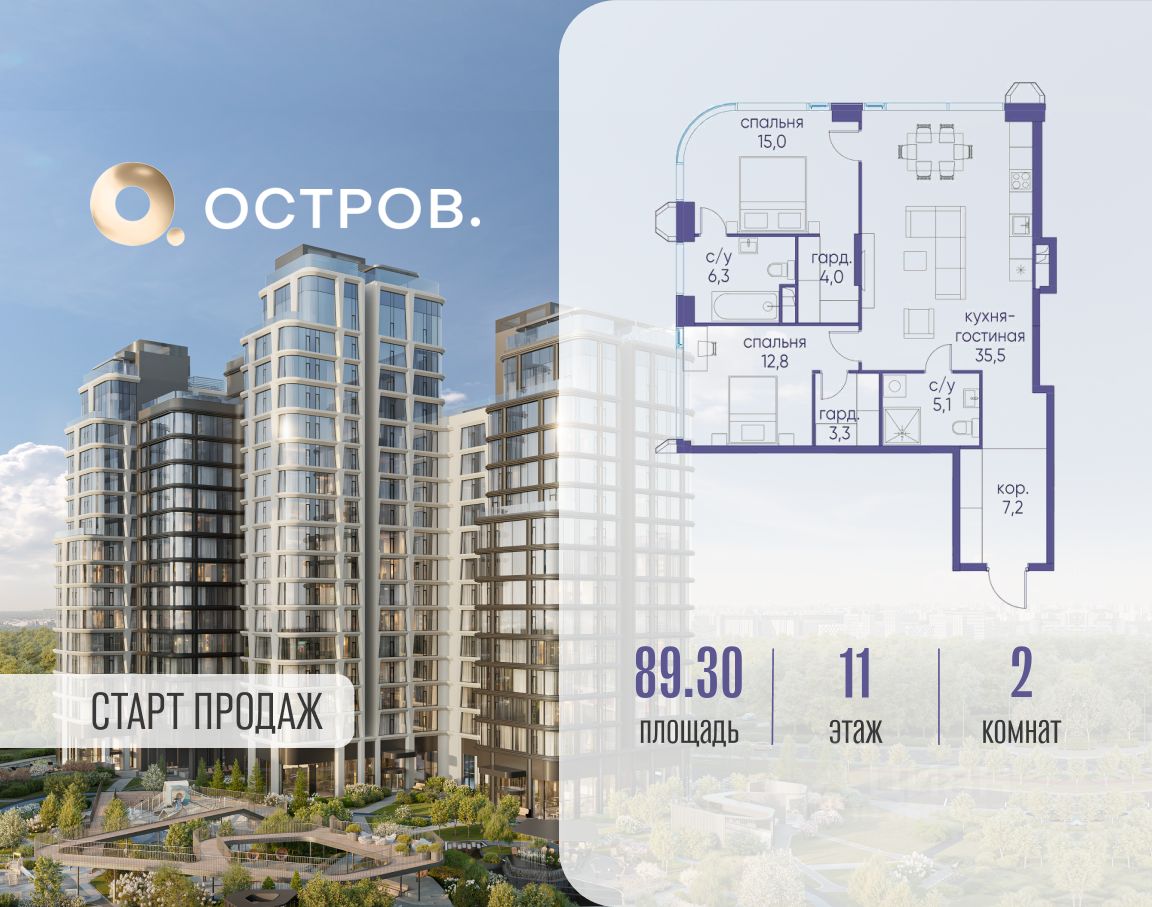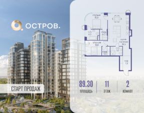 Продаётся 2-комн. квартира от застройщика: общая площадь 89.30 м², жилая 27.80 м², кухня 35.50 м², 11-й этаж, жилой квартал "Остров 12", корпус 1 (секция 2). Срок сдачи: 1 квартал 2029 года.