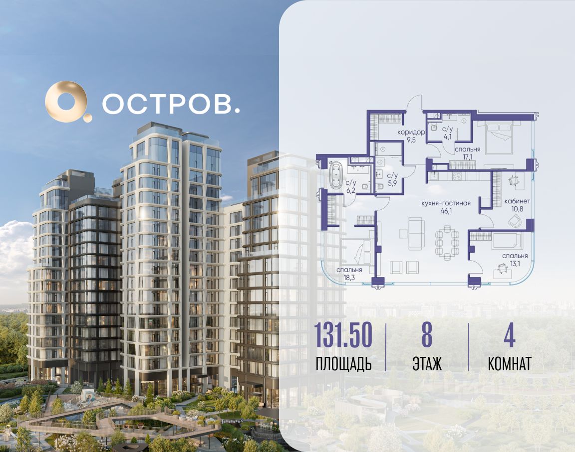 Продаётся 4-комн. квартира от застройщика: общая площадь 131.50 м², жилая 59.30 м², кухня 46.10 м², 8-й этаж, жилой квартал "Остров 12", корпус 1 (секция 3). Срок сдачи: 1 квартал 2029 года.