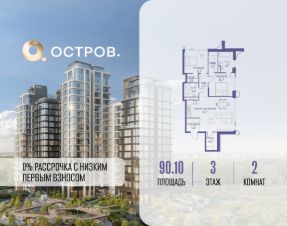 Продаётся 2-комн. квартира от застройщика: общая площадь 90.10 м², жилая 26.80 м², кухня 37.10 м², 3-й этаж, жилой квартал "Остров 12", корпус 1 (секция 2). Срок сдачи: 1 квартал 2029 года.