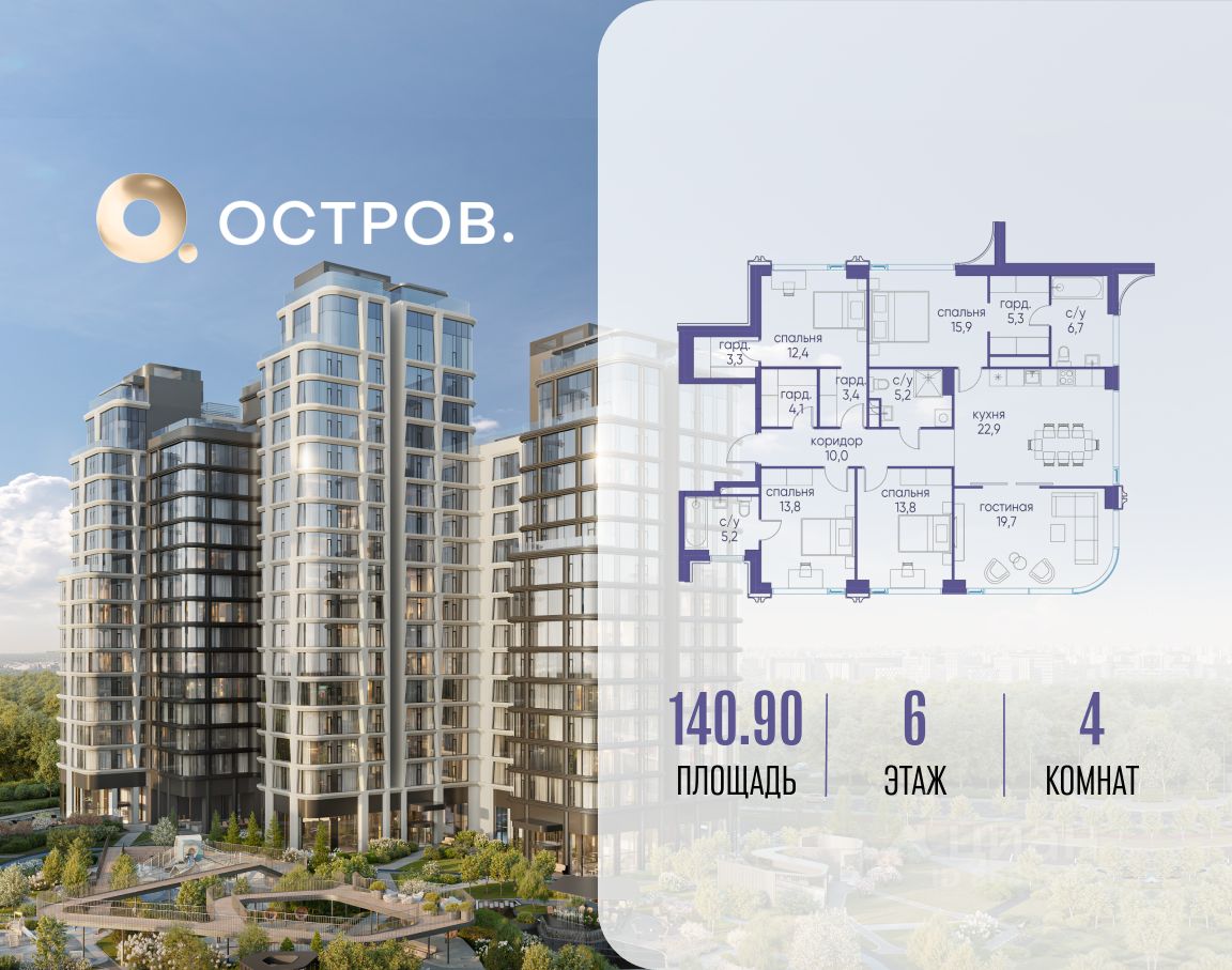 Продаётся 4-комн. квартира от застройщика: общая площадь 140.90 м², жилая 55.90 м², кухня 42.60 м², 6-й этаж, жилой квартал "Остров 12", корпус 1 (секция 1). Срок сдачи: 1 квартал 2029 года.