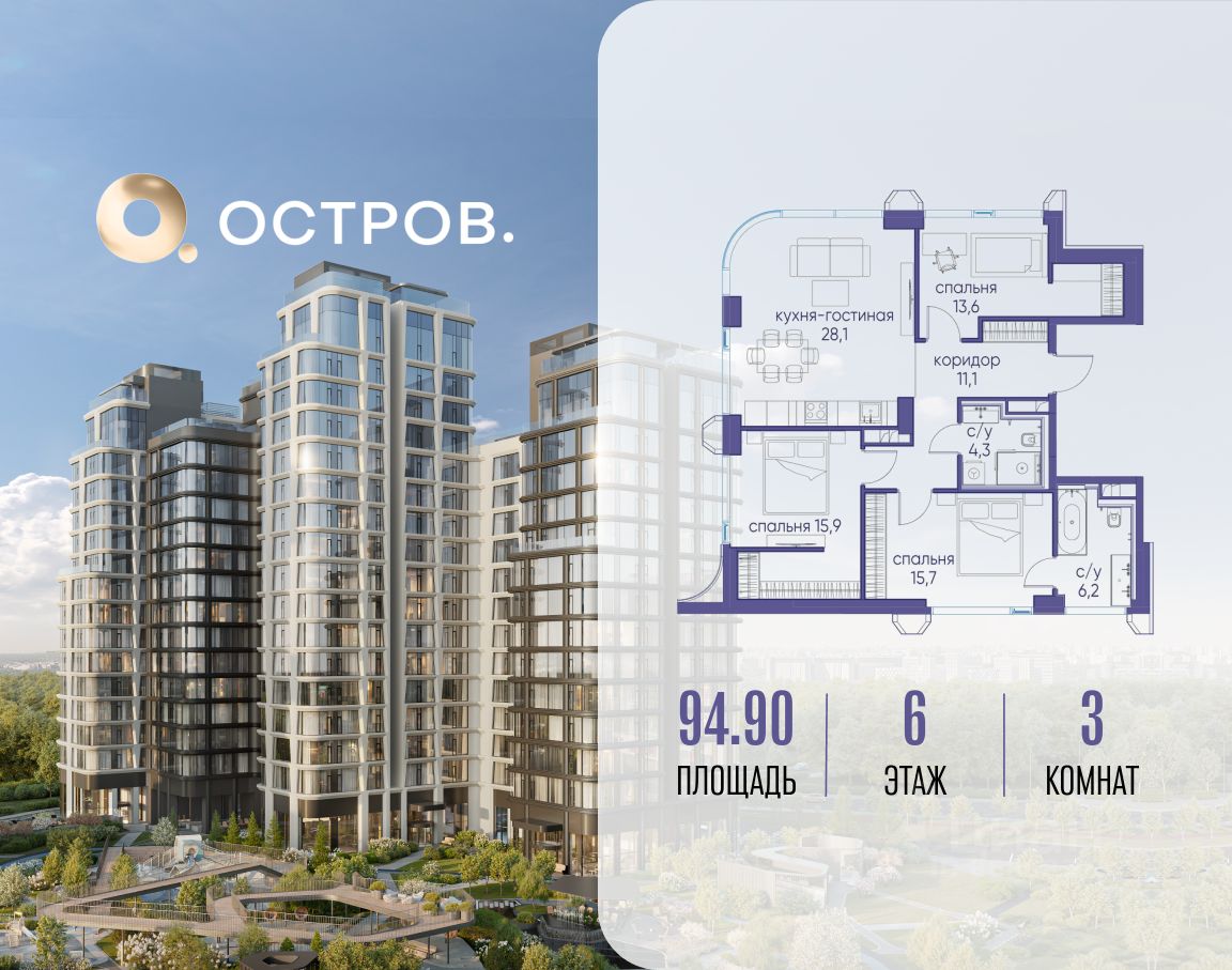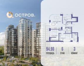 Продаётся 3-комн. квартира от застройщика: общая площадь 94.90 м², жилая 45.20 м², кухня 28.10 м², 6-й этаж, жилой квартал "Остров 12", корпус 1 (секция 3). Срок сдачи: 1 квартал 2029 года.