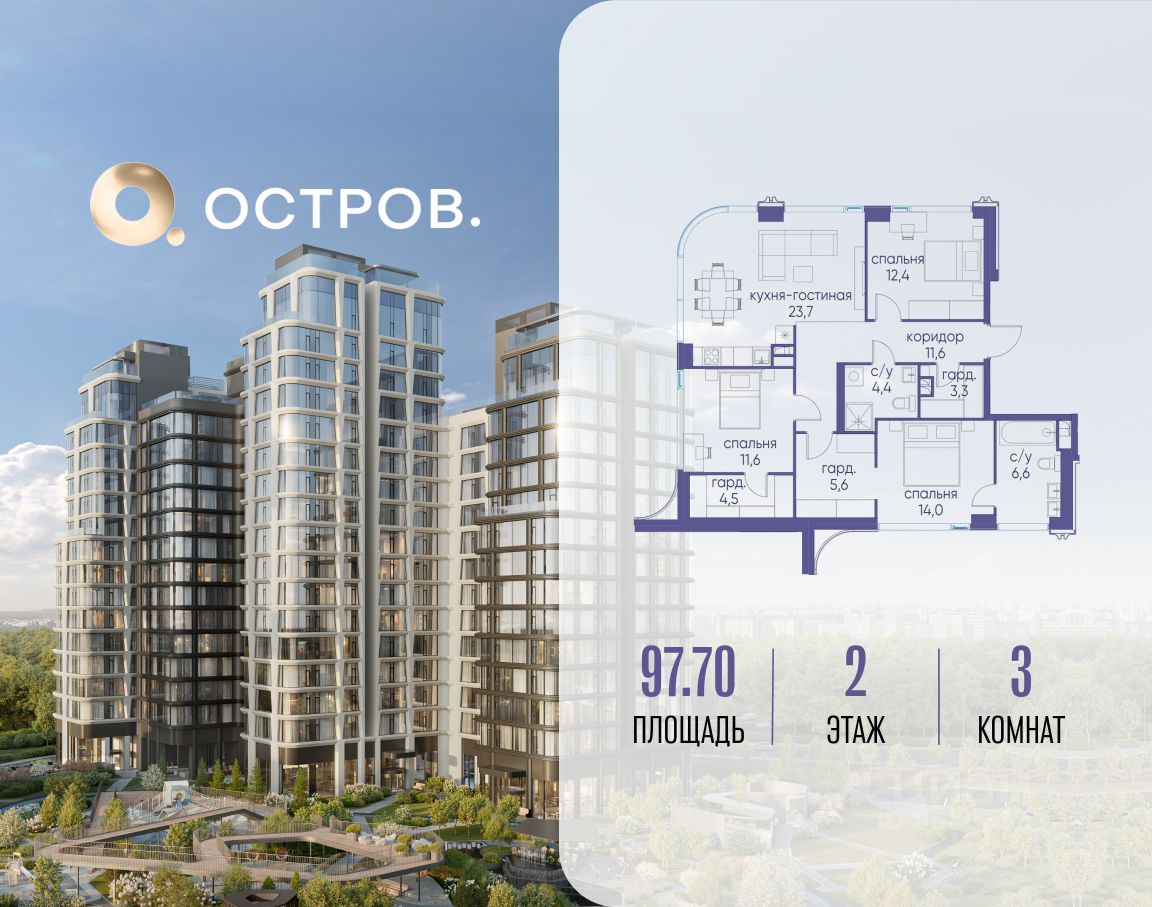 Продаётся 3-комн. квартира от застройщика: общая площадь 97.70 м², жилая 38.00 м², кухня 23.70 м², 2-й этаж, жилой квартал "Остров 12", корпус 1 (секция 2). Срок сдачи: 1 квартал 2029 года.