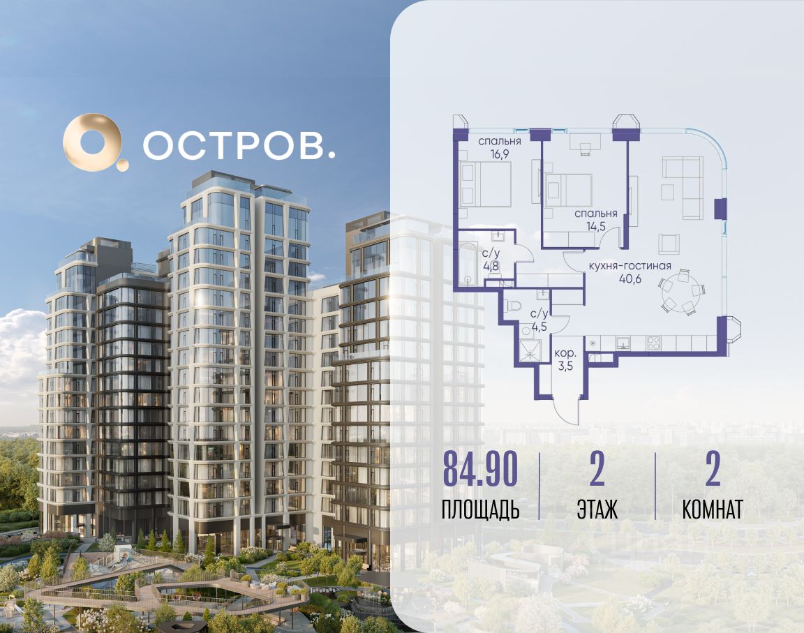Продаётся 2-комн. квартира от застройщика: общая площадь 84.90 м², жилая 31.40 м², кухня 40.60 м², 2-й этаж, жилой квартал "Остров 12", корпус 1 (секция 1). Срок сдачи: 1 квартал 2029 года.