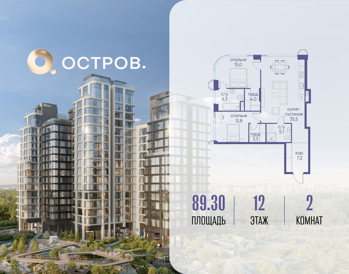 Продаётся 2-комн. квартира от застройщика: общая площадь 89.30 м², жилая 27.80 м², кухня 35.50 м², 12-й этаж, жилой квартал "Остров 12", корпус 1 (секция 2). Срок сдачи: 1 квартал 2029 года.