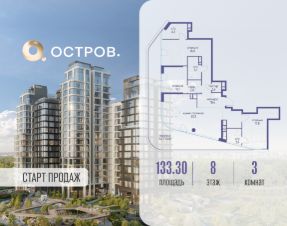 Продаётся 3-комн. квартира от застройщика: общая площадь 133.30 м², жилая 47.90 м², кухня 33.30 м², 8-й этаж, жилой квартал "Остров 12", корпус 6 (секция 1). Срок сдачи: 1 квартал 2029 года.