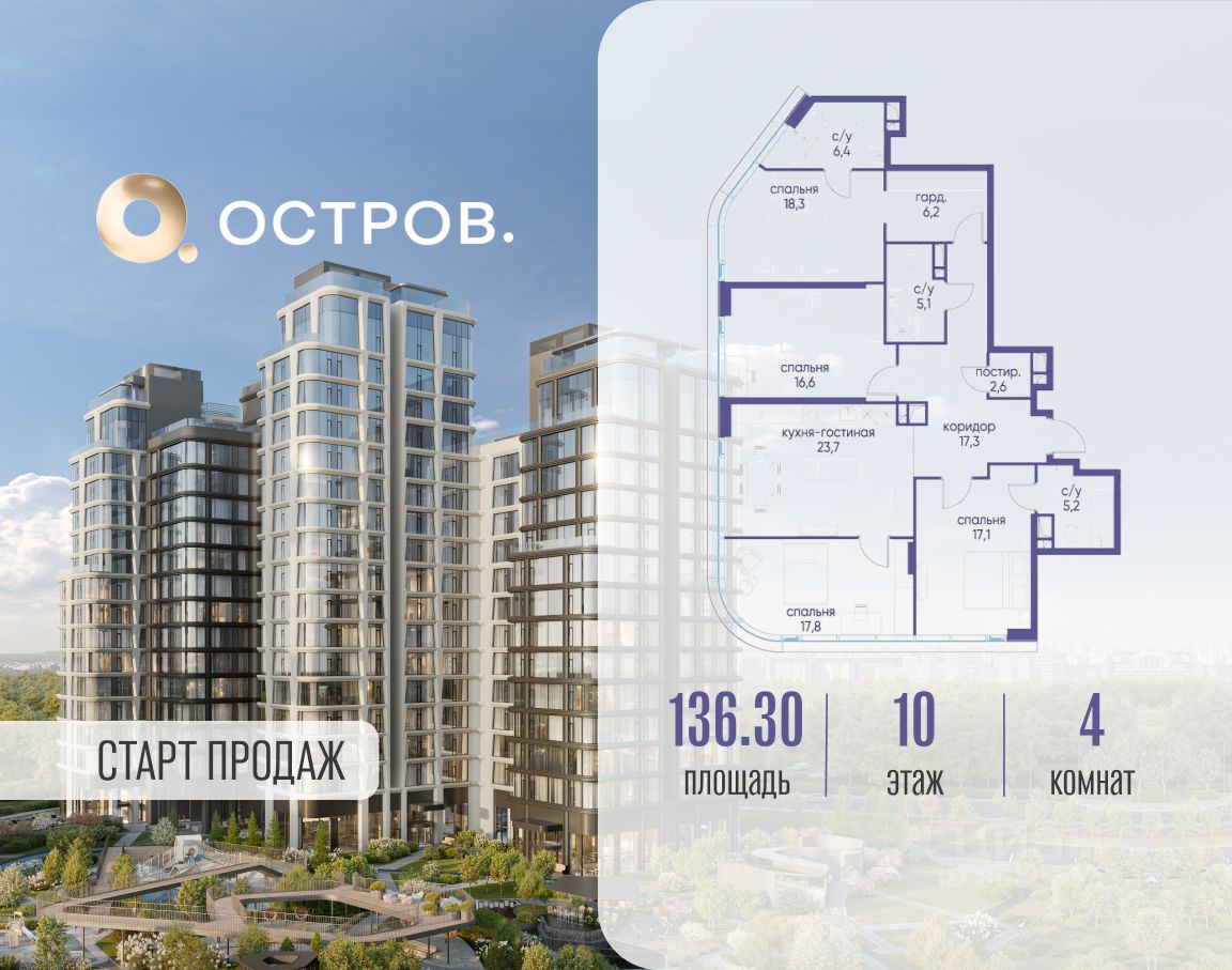 Продаётся 4-комн. квартира от застройщика: общая площадь 136.30 м², жилая 69.80 м², кухня 23.70 м², 10-й этаж, жилой квартал "Остров 12", корпус 6 (секция 1).  Срок сдачи: 1 квартал 2029 года.