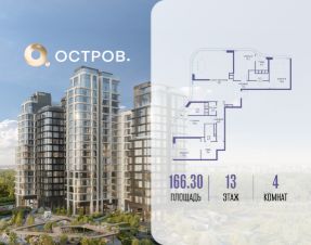 Продаётся 4-комн. квартира от застройщика: общая площадь 166.30 м², жилая 62.50 м², кухня 52.10 м², 13-й этаж, жилой квартал "Остров 12", корпус 6 (секция 1). Срок сдачи: 1 квартал 2029 года.