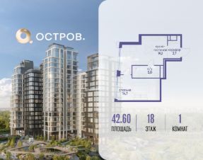Продаётся однокомнатная квартира от застройщика: общая площадь 42.60 м², жилая 14.70 м², кухня 19.20 м², 18, жилой квартал "Остров 12", корпус 3 (12.1 квартал) (секция 1). срок сдачи: 4-кв. 2025.