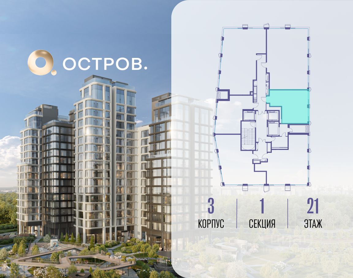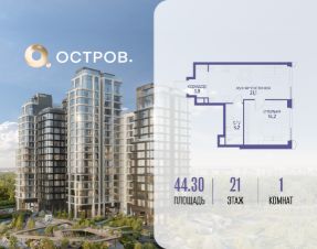 Продаётся однокомнатная квартира от застройщика: общая площадь 44.30 м², жилая 14.20 м², кухня 21.10 м², 21, жилой квартал "Остров 12", корпус 3 (12.1 квартал) (секция 1). срок сдачи: 4-кв. 2025.