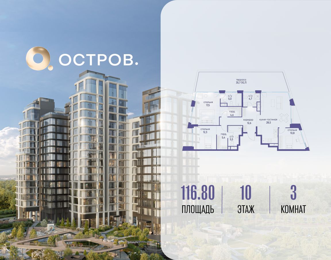 Продаётся трехкомнатная квартира от застройщика: общая площадь 116.80 м², жилая 40.60 м², кухня 28.50 м², 10, жилой квартал "Остров 12", корпус 1 (12.1 квартал) (секция 2). срок сдачи: 4-кв. 2025.