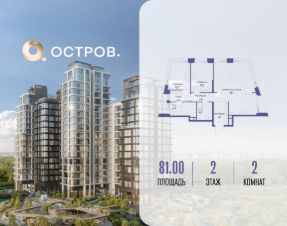 Продаётся двухкомнатная квартира от застройщика: общая площадь 81.00 м², жилая 21.70 м², кухня 34.10 м², 2, жилой квартал "Остров 12", корпус 1 (12.1 квартал) (секция 2). срок сдачи: 4-кв. 2025.