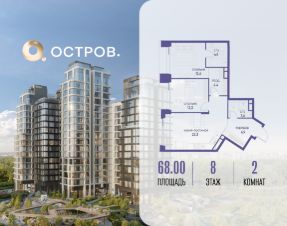 Продаётся двухкомнатная квартира от застройщика: общая площадь 68.00 м², жилая 24.90 м², кухня 23.30 м², 8, жилой квартал "Остров 12", корпус 1 (12.1 квартал) (секция 1). срок сдачи: 4-кв. 2025.