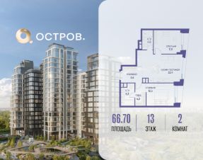 Продаётся двухкомнатная квартира от застройщика: общая площадь 66.70 м², жилая 24.20 м², кухня 22.40 м², 13, жилой квартал "Остров 12", корпус 1 (12.1 квартал) (секция 2). срок сдачи: 4-кв. 2025.