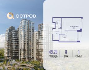 Продаётся однокомнатная квартира от застройщика: общая площадь 49.20 м², жилая 14.80 м², кухня 21.70 м², 8, жилой квартал "Остров 12", корпус 1 (12.1 квартал) (секция 2). срок сдачи: 4-кв. 2025.