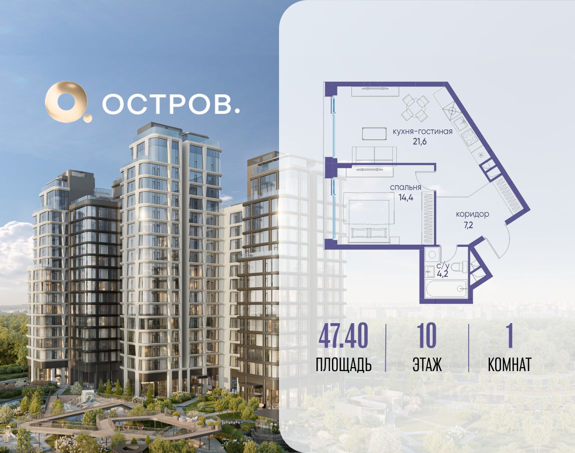 Продаётся однокомнатная квартира от застройщика: общая площадь 47.40 м², жилая 14.40 м², кухня 21.60 м², 10, жилой квартал "Остров 12", корпус 1 (12.1 квартал) (секция 1). срок сдачи: 4-кв. 2025.