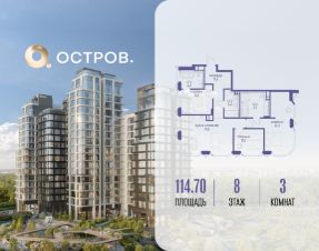 Продаётся 3-комн. квартира от застройщика: общая площадь 114.70 м², жилая 50.30 м², кухня 31.80 м², 8-й этаж, жилой квартал "Остров 12", корпус 2 (секция 1). Срок сдачи: 1 квартал 2029 года.