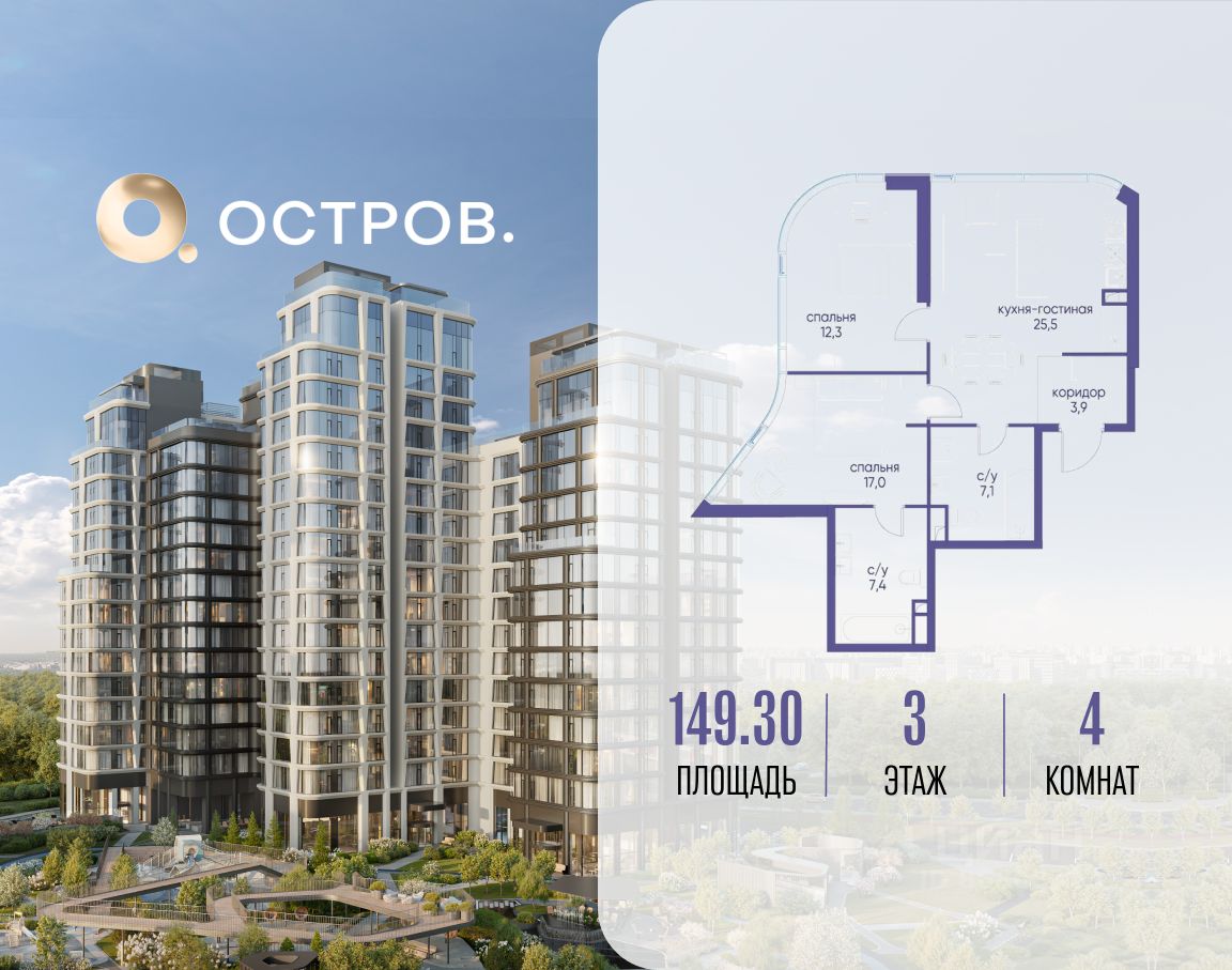 Продаётся 4-комн. квартира от застройщика: общая площадь 149.30 м², жилая 29.30 м², кухня 25.50 м², 3-й этаж, жилой квартал "Остров 12", корпус 2 (секция 1). Срок сдачи: 1 квартал 2029 года.