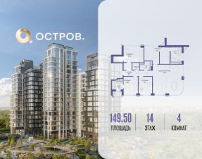 Продаётся 4-комн. квартира от застройщика: общая площадь 149.50 м², жилая 68.90 м², кухня 47.80 м², 14-й этаж, жилой квартал "Остров 12", корпус 2 (секция 1). Срок сдачи: 1 квартал 2029 года.
