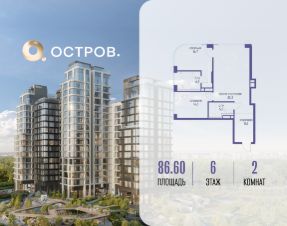 Продаётся 2-комн. квартира от застройщика: общая площадь 86.60 м², жилая 30.80 м², кухня 35.30 м², 6-й этаж, жилой квартал "Остров 12", корпус 2 (секция 2). Срок сдачи: 1 квартал 2029 года.