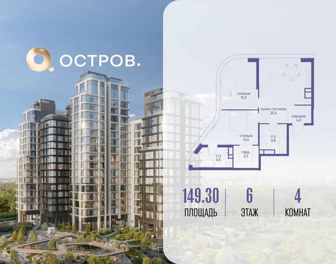 Продаётся 4-комн. квартира от застройщика: общая площадь 149.30 м², жилая 29.50 м², кухня 25.40 м², 6-й этаж, жилой квартал "Остров 12", корпус 2 (секция 1). Срок сдачи: 1 квартал 2029 года.