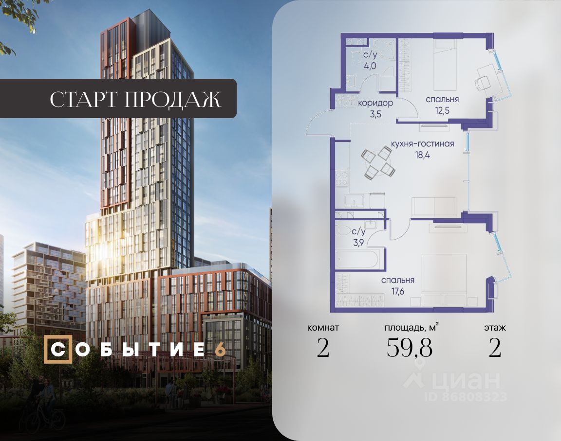 Продаётся 2-комнатная квартира от застройщика: общая площадь 59.80 м², жилая 30.10 м², кухня 18.40 м², 2-й этаж, жилой квартал "Событие-6", корпус 2 (секция 2) Срок сдачи: 1 квартал 2029 года.